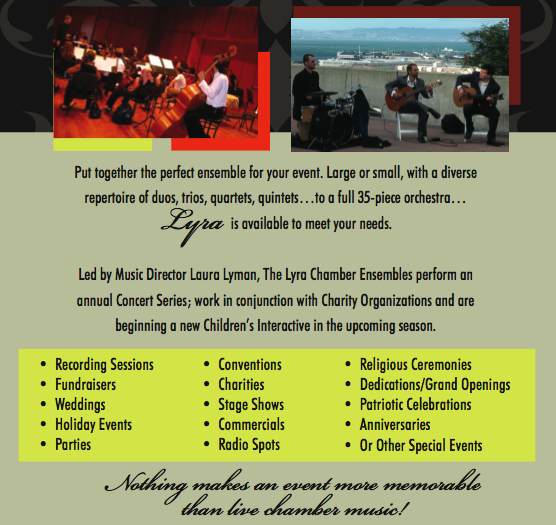 The Lyra Chamber Ensembles offer a range of musical groupings to meet the needs of any project. Whether it be a film score, live performance or commercial recording we can bring your event to a higher level. From a strolling violinist or a trio of your favorite instruments at a wedding to an entire Chamber Orchestra for your radio spot– this professional group of musicians will tailor a unique performance for your event... adding a touch of elegance to any occasion and a level of excellence to any project.